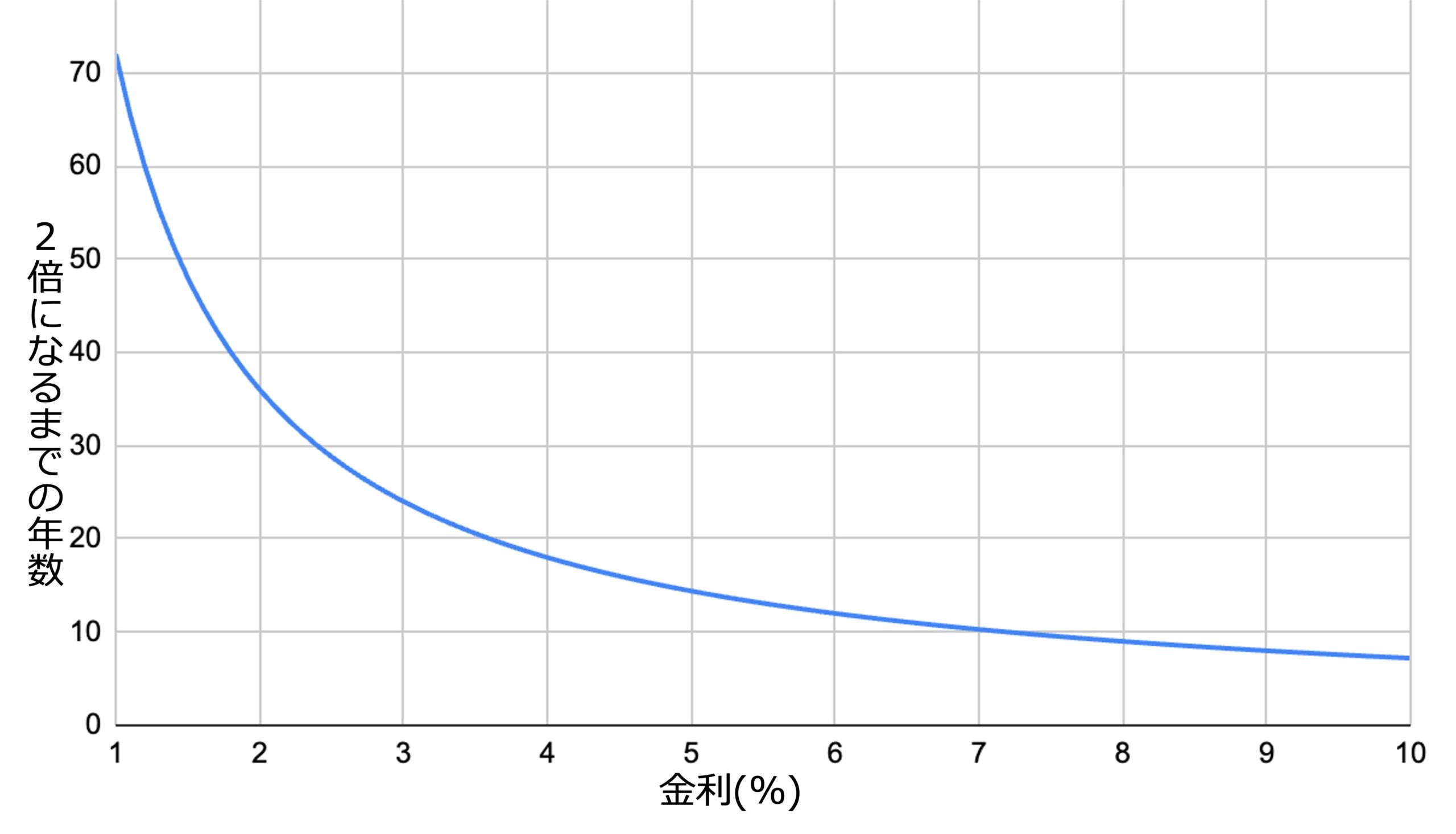 ちなみに、2倍になるまでの年数と金利をグラフにしてみると以下のようになります。