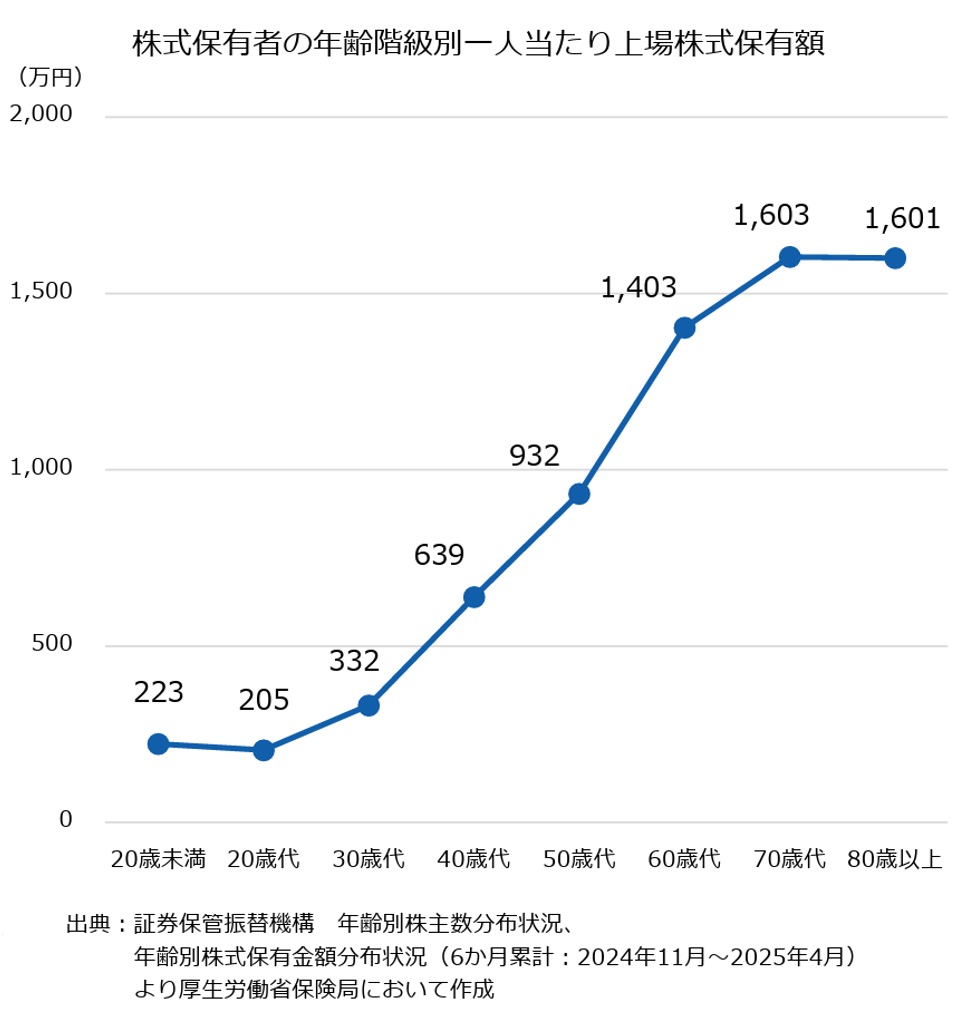 まずは、一人当たりの上場株式の保有額が示されており、70歳以上は1,600万円程度というデータが示されています。