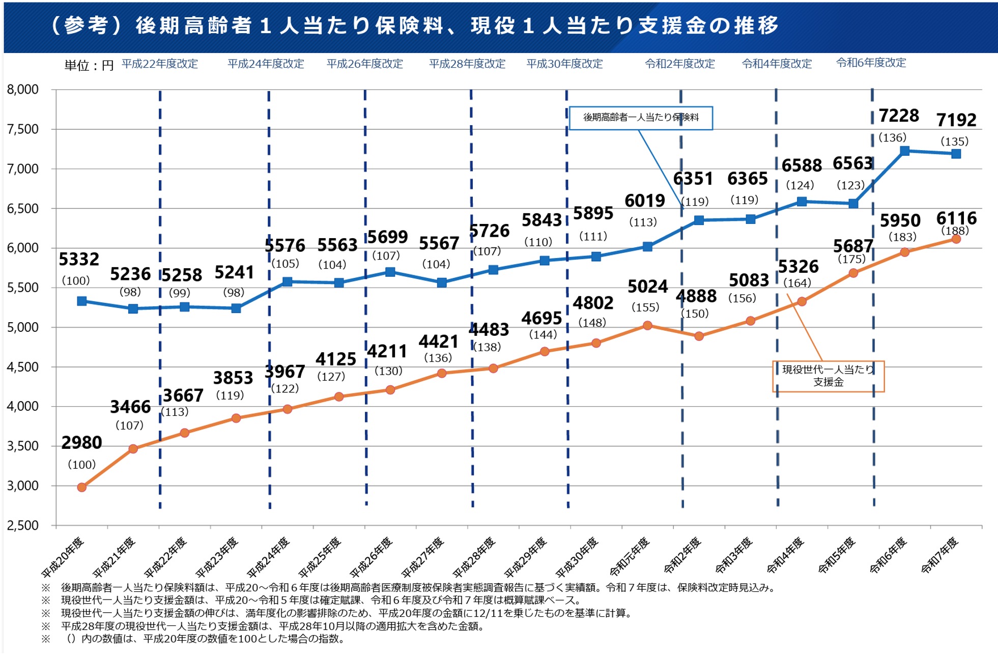 平成20年には、保険料5,332円、現役世代支援金額2,980円だったものが、令和7年度は保険料7,192円、現役世代支援金額6,116円になっています。保険料が約1.35倍になったのに対し、現役世代支援金額は約2.05倍になっており、負担が増加していることがわかります。