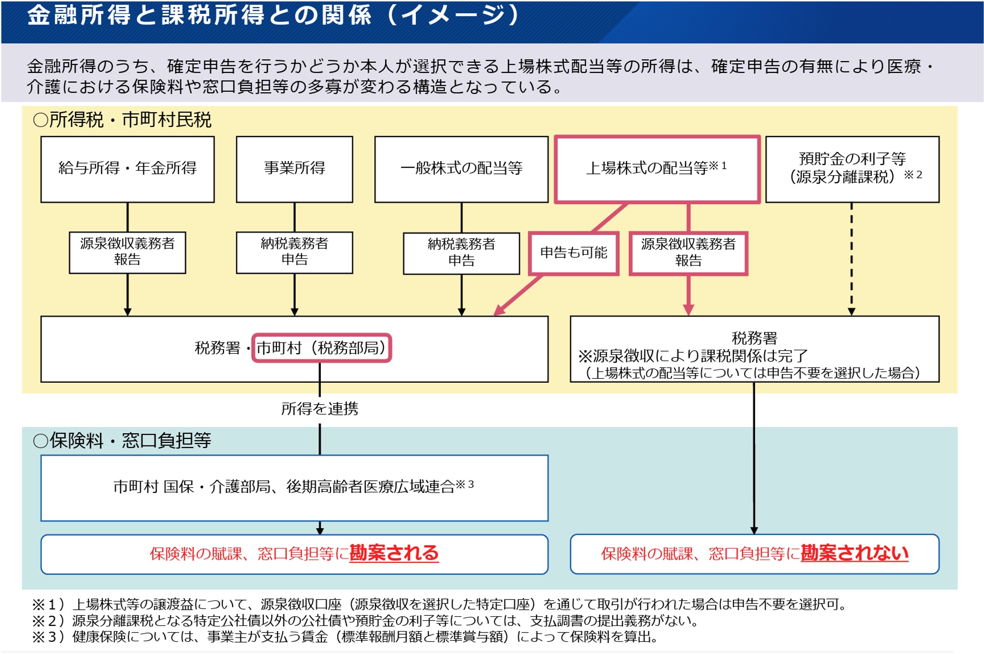 - 確定申告不要を選択した金融所得は、市町村民税の所得として認識されず、そのため保険料や自己負担割合に所得が反映されない