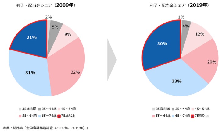さらに、利子・配当金の年代別のシェアが75歳以上で増加していることが示されています。