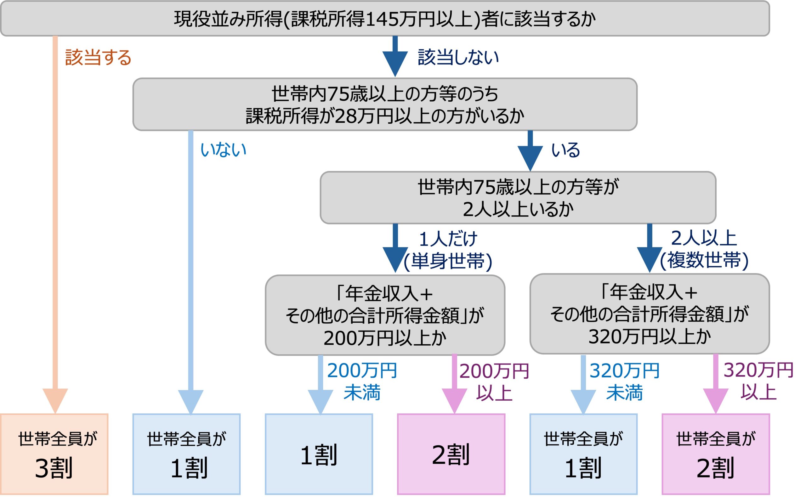 75歳以上の後期高齢者医療制度の場合、自己負担は原則1割負担、一定所得以上がある場合に2割負担、現役並み所得がある場合に3割負担となります。課税所得や年金収入等をもとに、世帯単位で一部負担割合を判定します。