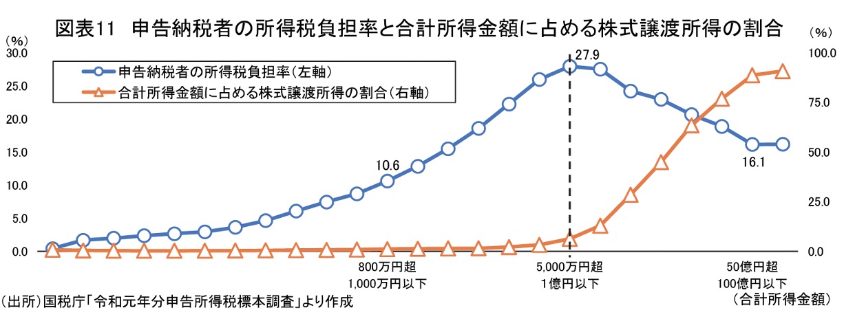 - 「1億円の壁」は、合計所得が1億円を超えると実効税率が下がっている問題を指す