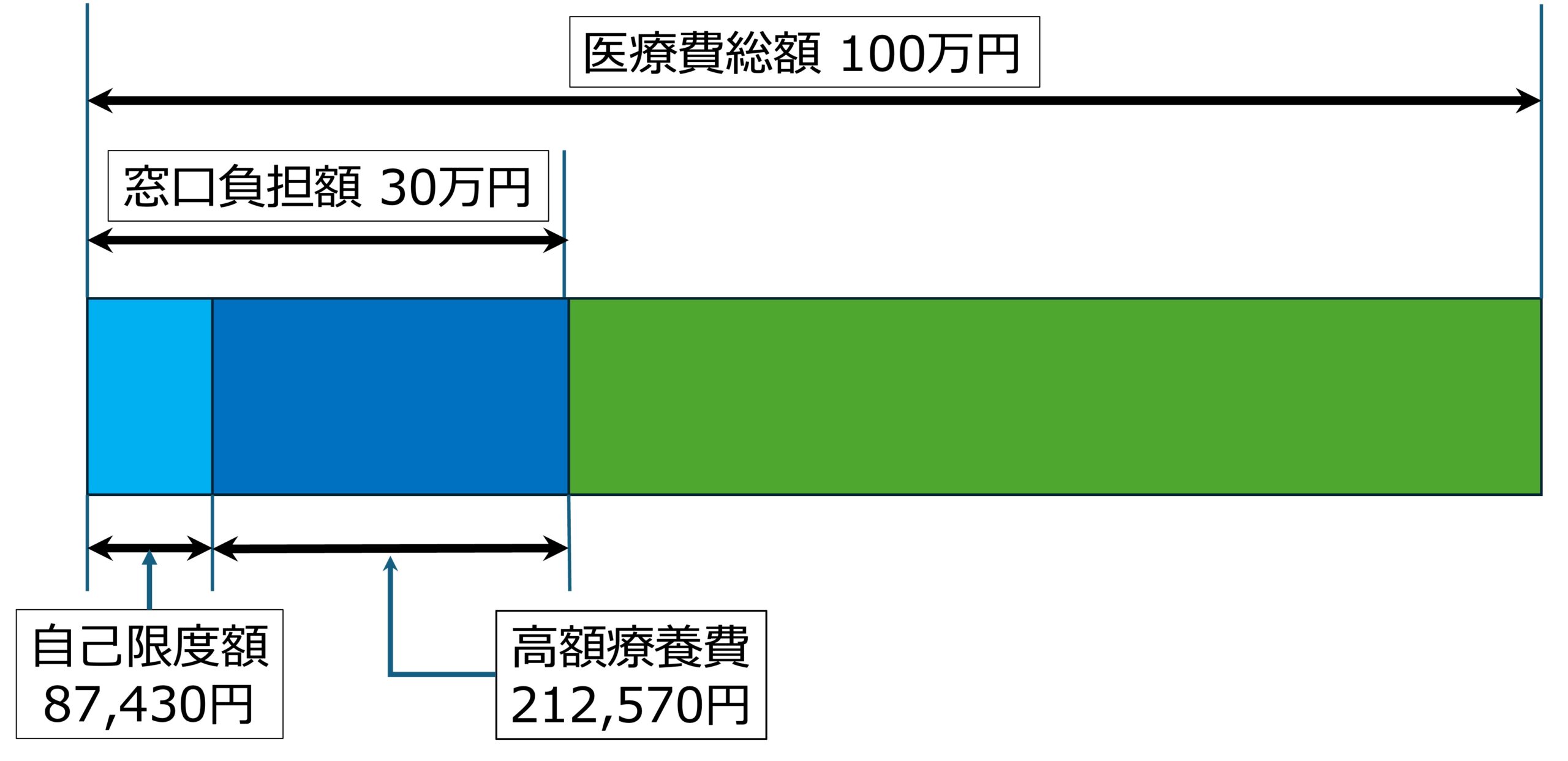 上の図では、1ヶ月の医療費総額が100万円、窓口負担が3割の場合の高額療養費を表しています。自己限度額は年齢と所得水準によって決められており、年収約370~約770万円の場合は以下の式によって計算されます。