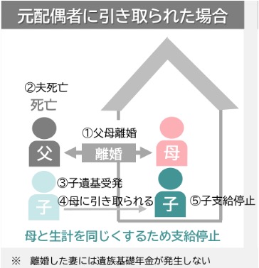 離婚した配偶者の一人と同居することになった後、養育者が死亡した場合で、片親側に引き取れれたケースです。この場合、当初養育者とならなかったものには遺族基礎年金が発生しません。