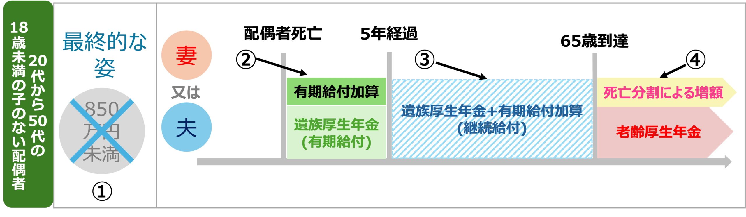 - 遺族厚生年金と遺族基礎年金を受けていた子のある妻が、子が18歳到達年度の末日に達した(障害の状態にある場合は20歳に達した)等のため、遺族基礎年金を受給できなくなったとき