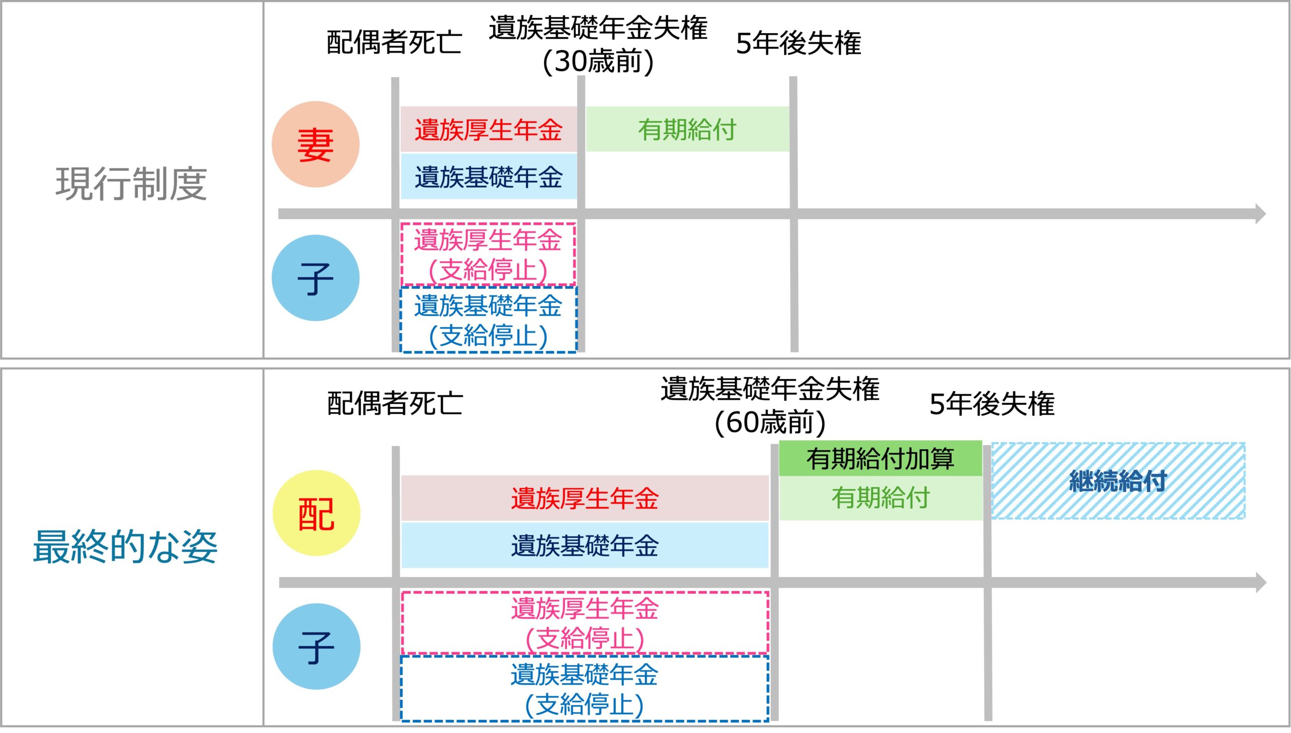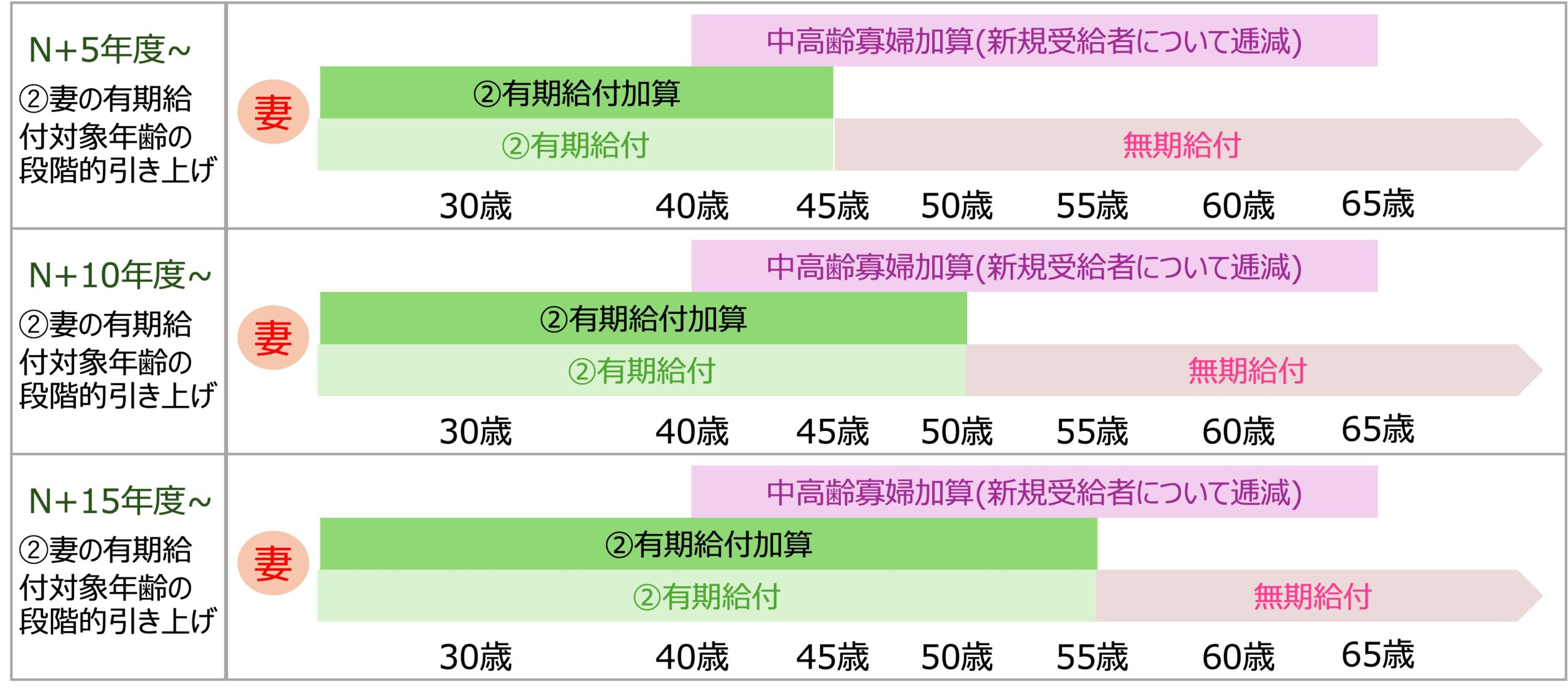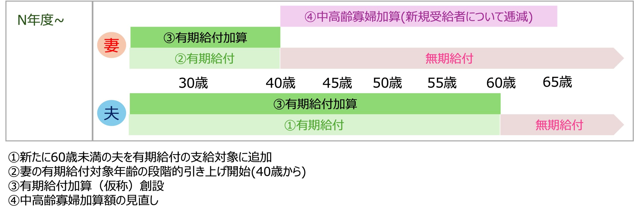 初年度では、夫については最終型に変更され、妻については現在30歳未満となっている有期給付を40歳未満にするとともに有期給付加算が付加されます。また、中高齢寡婦加算については新規受給をやめるとしています。