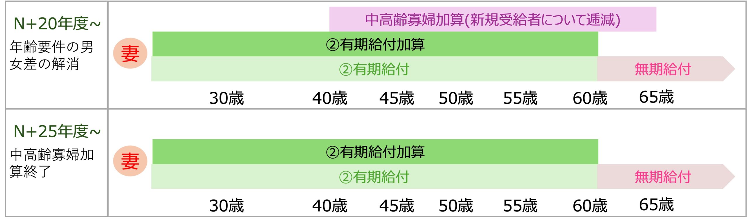 20年経つと男女差が解消され、25年で中高齢寡婦加算がなくなることになります。