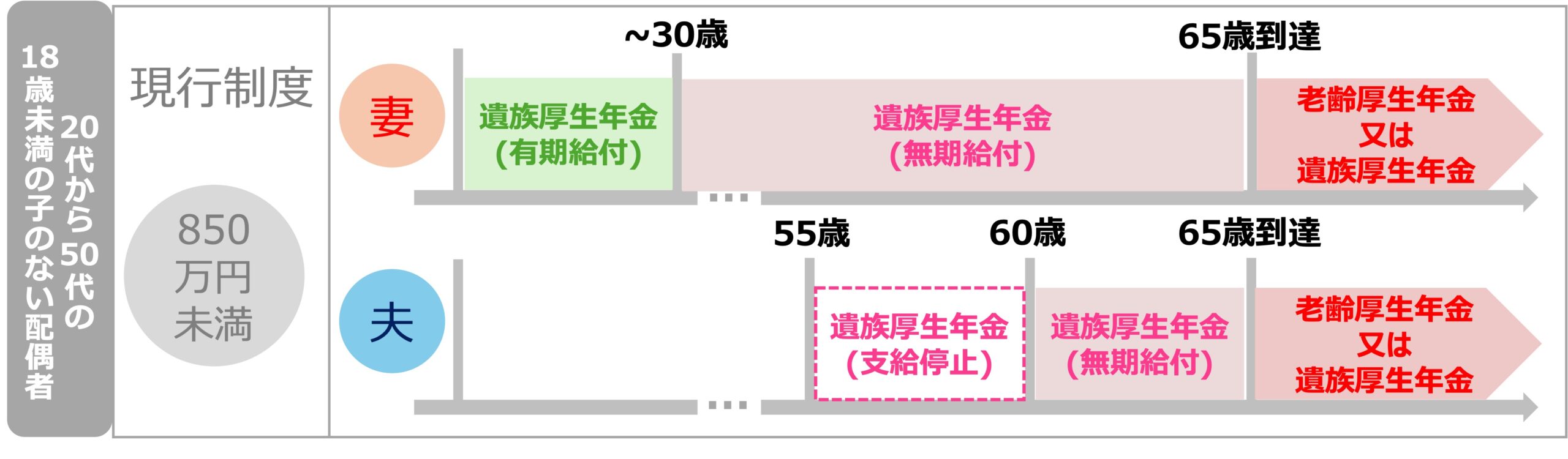 子のない配偶者の現行の遺族年金は以下のようなイメージになっています。