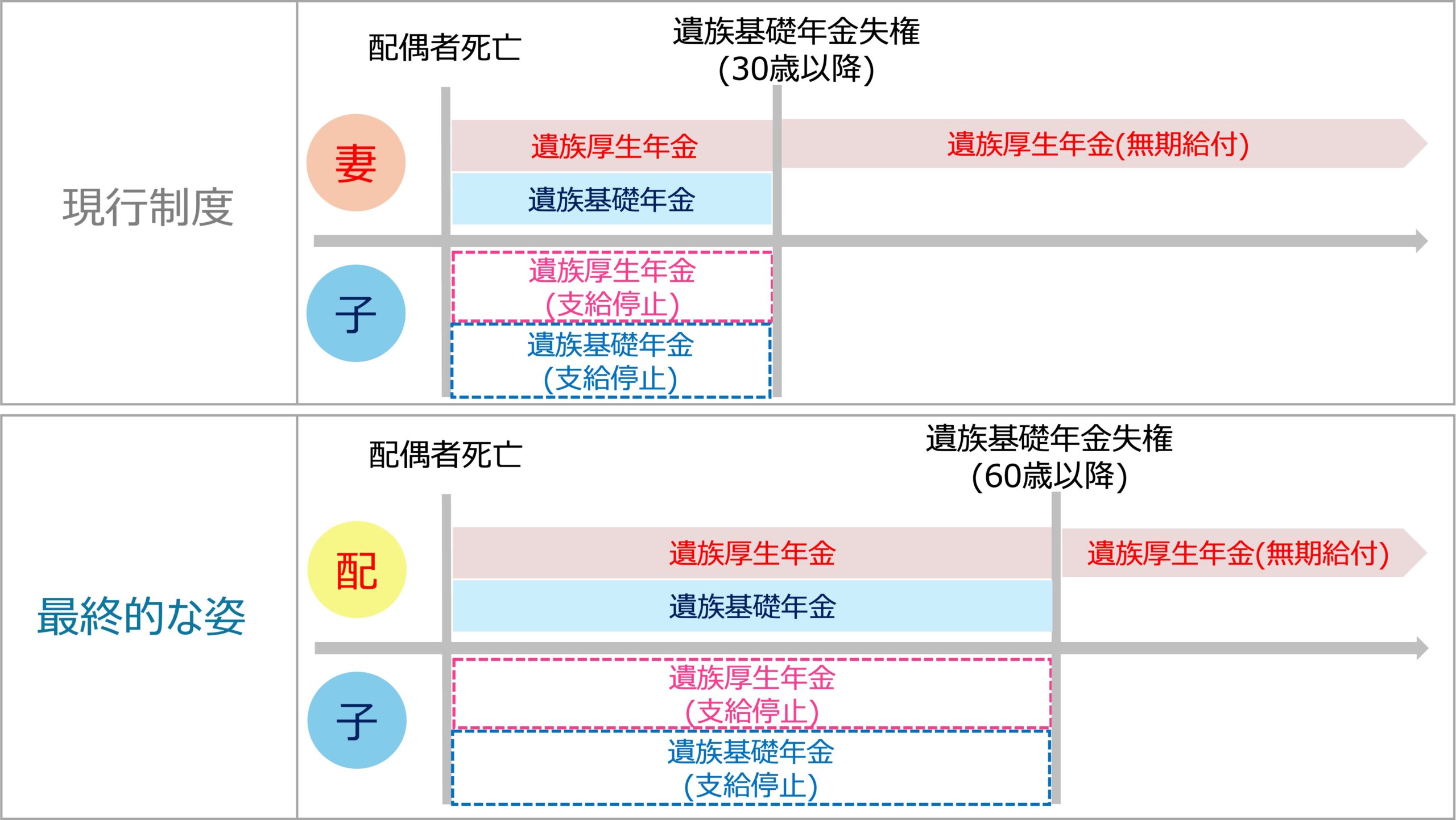 遺族厚生年金が有期年金とならない例外がふたつあります。ひとつは60歳以降の高齢期に配偶者を亡くした場合、もうひとつは上記改正法前に受給権が発生している場合で、いずれも現行制度の給付内容を維持して無期限給付になります。