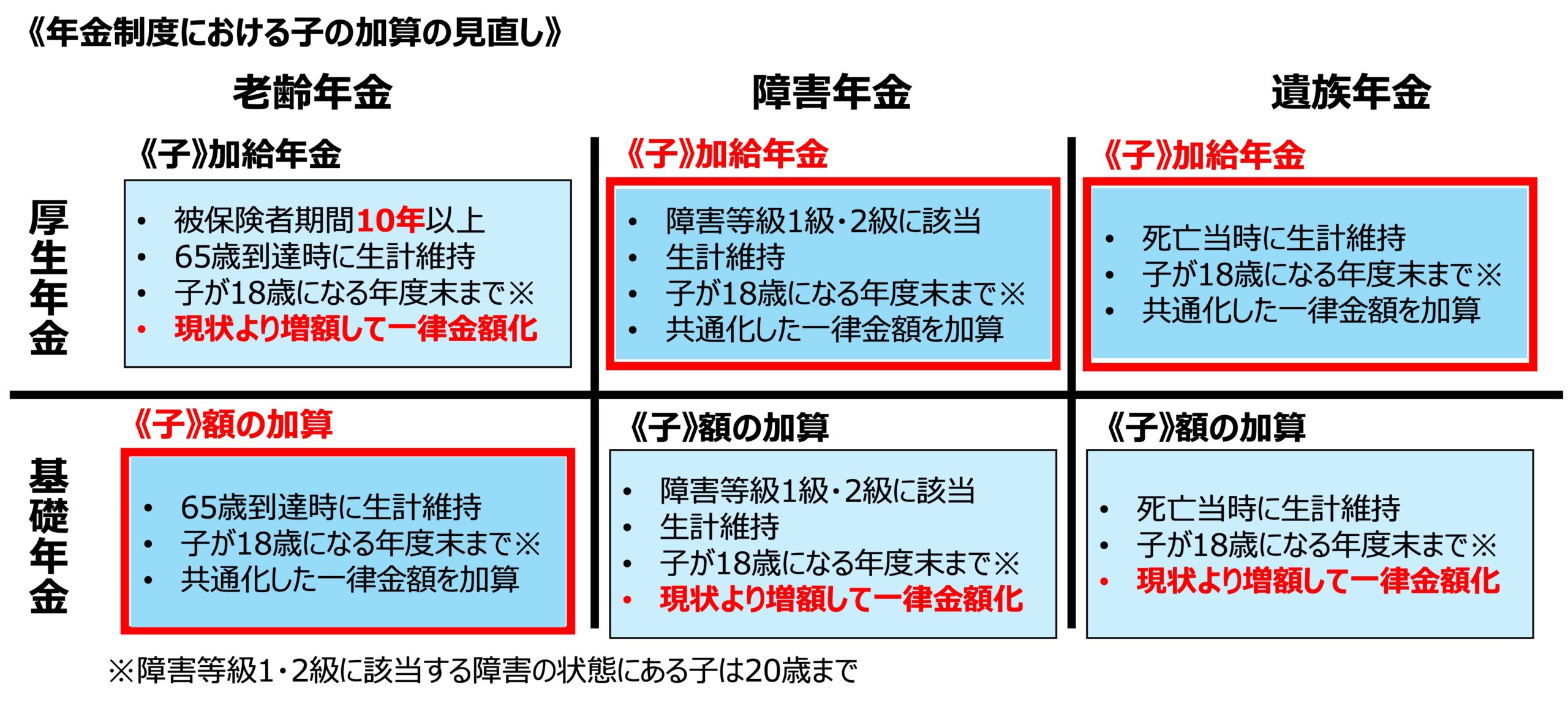 - こうした足もとの変化を受けて、年金制度においても、さらに、次代の社会を担う子どもの育ちを支援し、子を持つ年金受給者の保障を強化する観点から、次のような視点で見直しを検討してはどうか。