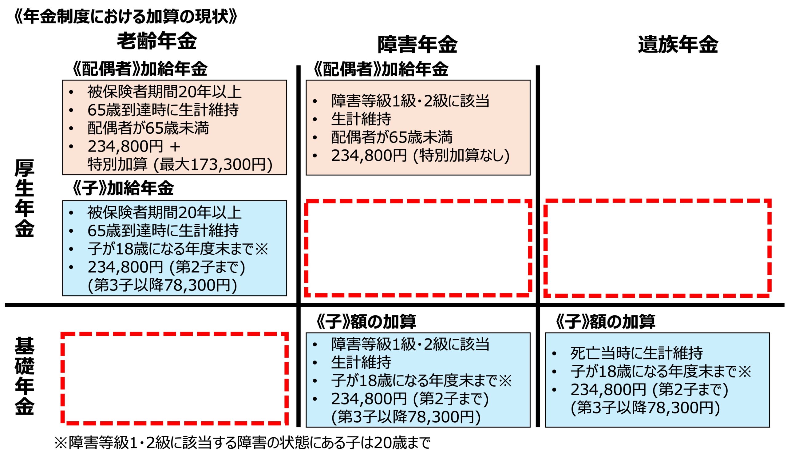 現行制度では、老齢厚生年金・障害厚生年金の受給権を得たときに、生計を維持する配偶者・子がいる場合に、年金給付の額に加給年金額が加算されます。