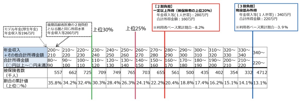 - 現状2割・3割負担対象者は所得上位約20%の層だが、これを上位25~30%の層まで拡大する案が検討されている