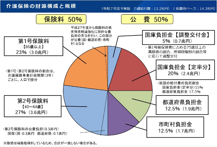 介護保険制度の財源は、公費(税金)50%、保険料50%(第1号保険料23%、第2号保険料27%)で構成されています。