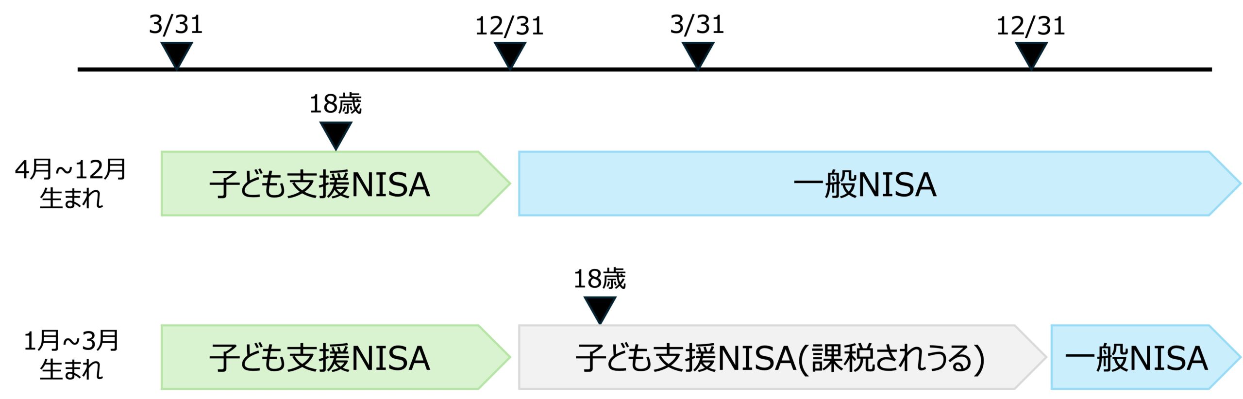 ちょっと混乱するのが、一般NISAでは年齢の基準点が1月1日時点であるのに対し、子ども支援NISAの年齢の基準時点が3月31日になっていることです。この点については、資産をどのようにNISAに移管していくかに影響するので後ほど詳しく説明します。